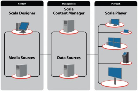 En komplet Scala løsning opbygges omkring de 3 stykker software, Scala Designer, Scala Content Manager og Scala Player.